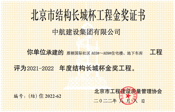 经北京市优质工程评审委员会专家组评检、推荐、审议,2022年8月8日,由集团公司承建的陈各庄集体土地租赁住房项目(又称“雁栖国际社区”项目)被评为“2021-2022年度结构长城杯金奖工程”,10月11日正式获得奖杯和证书。